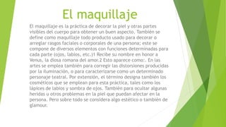 El maquillaje se define como la práctica de decorar la piel y otras partes visibles del cuerpo para mejorar el aspecto. También se refiere a los productos usados para arreglar rasgos faciales o corporales. El maquillaje ha evolucionado a través de los años, desde su uso en la antigüedad por los egipcios y griegos hasta convertirse en una tendencia clave en el siglo XXI, usado diariamente y promovido en los medios de comunicación.