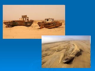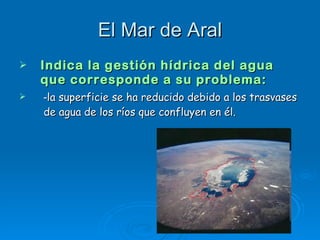 El documento trata sobre tres problemas medioambientales relacionados con la gestión del agua: 1) La desaparición del Mar de Aral debido a los trasvases de agua de los ríos para regadío, dejando altos niveles de salinidad y contaminación. 2) La presa de las Tres Gargantas en el río Yangtze que afectó a casi 2 millones de personas y causó pérdidas culturales. 3) Las Tablas de Daimiel en España, afectadas por la sobreexplotación de acuíferos para regadío