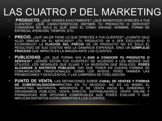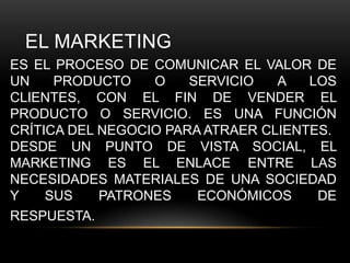 El marketing es el proceso de comunicar el valor de un producto o servicio a los clientes con el fin de venderlo. Es una función crítica del negocio para atraer clientes y representa el enlace entre las necesidades de una sociedad y sus patrones económicos. El marketing implica cuatro elementos clave: el producto, el precio, la publicidad y el punto de venta.