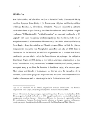 1) El documento presenta una biografía de Karl Marx, destacando que nació en Alemania en 1818 y murió en Londres en 1883. Fue un filósofo, sociólogo y economista que desarrolló teorías socialistas.