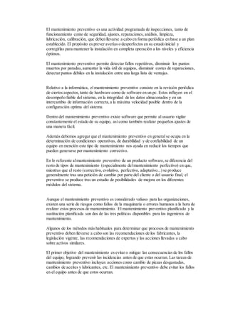 El mantenimiento preventivo implica inspecciones programadas, ajustes, reparaciones y limpieza periódica de equipos para prevenir averías. Esto permite detectar problemas temprano, aumentar la vida útil de los equipos, reducir costos y mejorar el desempeño. El mantenimiento preventivo incluye revisiones de hardware y software para garantizar un funcionamiento confiable y la integridad de los datos.