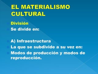 El documento explica el concepto de materialismo histórico, un enfoque antropológico y sociológico que sostiene que los factores materiales de una sociedad, como los modos de producción y reproducción, son los principales impulsores del cambio social y cultural. Se divide el materialismo histórico en infraestructura, estructura y supraestructura, donde la infraestructura incluye la producción y reproducción, la estructura incluye la economía doméstica y política, y la supraestructura incluye conceptos como el arte,
