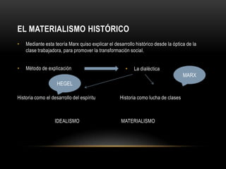 El documento resume la teoría del materialismo histórico de Marx. Explica que Marx quería explicar el desarrollo histórico desde la perspectiva de la clase trabajadora para promover el cambio social. Describe que Marx veía la historia como una lucha de clases determinada por las fuerzas productivas y las relaciones de producción, y que la sociedad pasa por etapas como la sociedad primitiva, el esclavismo, el feudalismo y el capitalismo antes de alcanzar el comunismo.