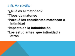 El documento describe el matoneo o acoso escolar, incluyendo sus tipos, causas e impactos. Explica que el matoneo consiste en el acoso físico y psicológico de un estudiante por sus compañeros. Los tipos de matoneo incluyen acoso verbal, exclusión social, intimidación física, difusión de rumores y ciberacoso. Los estudiantes matonean por necesidad de poder y satisfacción de causar daño. El matoneo tiene un amplio impacto e incluye depresión, baja autoestima y re