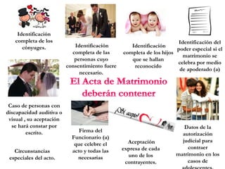 El matrimonio debe celebrarse ante una autoridad competente como el alcalde, registrador civil o capitán de un buque venezolano. La autoridad competente debe informar a los contrayentes sobre la naturaleza del matrimonio y sus deberes y derechos antes de preguntarles si consienten en casarse. Una vez que los contrayentes expresen su consentimiento, la autoridad los declarará casados en nombre de la República Bolivariana de Venezuela.