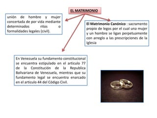 Este documento describe los elementos y requisitos del matrimonio y la unión estable de hecho en Venezuela. Define el matrimonio como la unión de un hombre y una mujer concertada de por vida mediante determinados ritos legales. Detalla los elementos necesarios para la existencia del matrimonio, el proceso de celebración y disolución del matrimonio, así como los tipos y causas de nulidad. También explica los elementos y requisitos de la unión estable de hecho o concubinato.