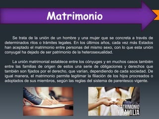 El documento trata sobre el matrimonio. Define el matrimonio, sus elementos, la celebración y disolución del mismo. Explica que el matrimonio es la unión de dos personas mediante rituales legales y establece derechos y obligaciones. Describe los requisitos, efectos y formas de disolución como el divorcio y la muerte de uno de los cónyuges.