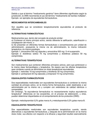 Este documento define varios términos relacionados con medicamentos genéricos y similares. Explica que en Argentina técnicamente ningún medicamento puede ser considerado genérico a pesar de cumplir con los requisitos de calidad, seguridad y eficacia. Distingue entre medicamentos de fuentes múltiples, intercambiables, alternativas farmacéuticas y terapéuticas. También define conceptos como principio activo, bioequivalencia, biodisponibilidad, innovador y de referencia.