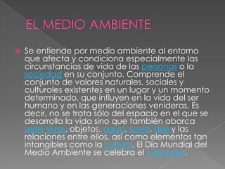 El documento habla sobre el medio ambiente y los problemas relacionados. Define el medio ambiente como el entorno que afecta las circunstancias de vida de las personas e incluye valores naturales, sociales y culturales. También menciona que el medio ambiente global está sufriendo un mayor deterioro debido al uso indiscriminado de recursos naturales y la falta de atención a los efectos negativos sobre los seres vivos.