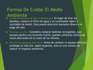 El documento habla sobre formas de cuidar el medio ambiente como limitar el consumo de agua embotellada, recargar baterías recargables y prolongar la vida útil de aparatos eléctricos. También describe tipos de residuos como orgánicos e inorgánicos y reciclables. Además, menciona que el plástico tarda mucho en destruirse y las consecuencias del mal cuidado del medio ambiente incluyen la contaminación del agua y aire y la desaparición de bosques y animales.