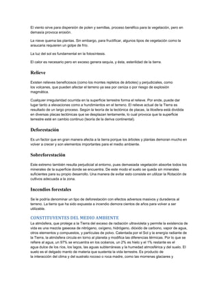 El documento define el medio ambiente y sus principales componentes como la atmósfera, agua y suelo. Explica que el ser humano ha modificado el medio ambiente a través de la agricultura, la revolución industrial y el uso de combustibles fósiles, lo que ha causado problemas como el aumento de dióxido de carbono en la atmósfera y el calentamiento global.