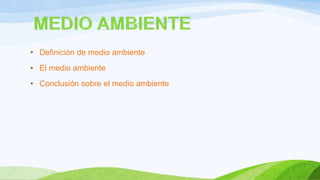 El documento define el medio ambiente como el sistema formado por elementos naturales y artificiales que están interrelacionados y son modificados por la acción humana, incluyendo valores naturales, sociales y culturales. Explica que el medio ambiente incluye factores físicos, biológicos y socioeconómicos. Concluye que debemos cuidar el medio ambiente para garantizar la vida sostenible de las generaciones actuales y futuras.