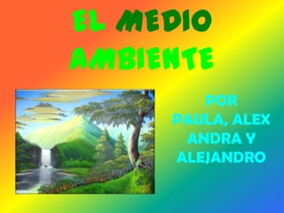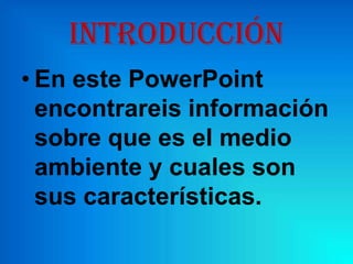 El documento presenta información sobre el medio ambiente. Define el medio ambiente como el conjunto de elementos que rodean a un ser vivo e influyen en su vida, incluyendo la atmósfera y el agua. Explica que las personas modifican el medio ambiente a través de sus acciones y que esto ha causado problemas como la contaminación, el calentamiento global, la deforestación y la pérdida de biodiversidad. El documento concluye con la esperanza de que la información haya sido útil.