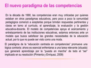 El documento aborda el nuevo paradigma de la educación centrada en competencias, destacando su aceptación progresiva en la comunidad pedagógica desde la década de 1990 por su relevancia en currículo y evaluación. Se presentan diferentes enfoques sobre competencias y la importancia de integrar conocimientos, actitudes y valores para formar estudiantes competentes. Se describen componentes fundamentales y criterios para medir aprendizajes desde el enfoque socioformativo, enfatizando la necesidad de una educación que prepare a los estudiantes para enfrentar problemas reales.