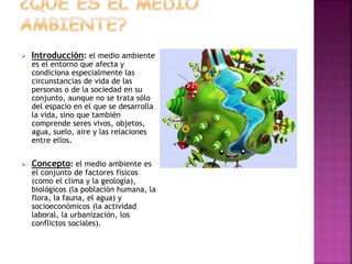 El documento trata sobre el concepto de medio ambiente. Explica que el medio ambiente incluye factores físicos, biológicos y socioeconómicos y sus interacciones. Además, argumenta que el medio ambiente es importante porque sin él no podríamos vivir y debemos protegerlo de la contaminación y daño para asegurar la sustentabilidad.