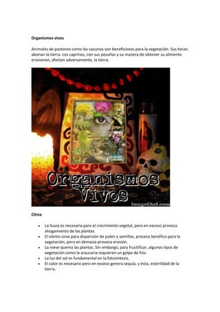 El documento habla sobre el medio ambiente. Define el medio ambiente como todo lo que rodea a los seres vivos, incluyendo factores naturales como organismos vivos, clima, relieve y deforestación, los cuales pueden afectar positiva o negativamente al entorno. También menciona que el 5 de junio se celebra el Día Mundial del Medio Ambiente para crear conciencia sobre la importancia de proteger el medio ambiente.