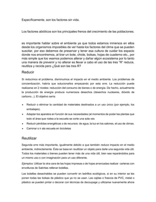 Este documento explica el concepto de medio ambiente y los factores bióticos y abióticos que lo componen. Define el medio ambiente como todo lo que rodea a un ser vivo, incluyendo otros seres vivos, objetos, agua, suelo, aire y sus interacciones. Describe los factores bióticos como los seres vivos de un ecosistema, clasificándolos en productores, consumidores y descomponedores. También explica los factores abióticos como los componentes físicos como el agua, la temperatura y el su