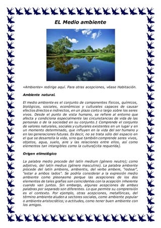 El documento habla sobre el medio ambiente y contiene 3 secciones principales:
