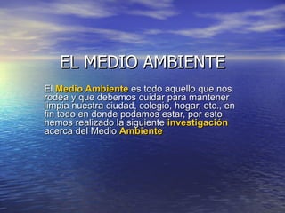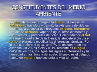 Este documento resume los principales componentes del medio ambiente y varios problemas ambientales causados por la actividad humana, incluyendo el aumento de dióxido de carbono y lluvia ácida debido al uso de combustibles fósiles, la destrucción de la capa de ozono por clorofluorocarbonos, la erosión del suelo y la escasez de agua potable. También discute los residuos nucleares como una amenaza continua para el medio ambiente.