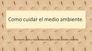 Este documento ofrece recomendaciones para cuidar el medio ambiente, incluyendo desconectar aparatos electrónicos cuando no se usen, apagar las luces innecesarias, usar transporte público en lugar de automóvil, separar la basura para reciclar, y participar en campañas para concientizar a otros sobre la protección ambiental.