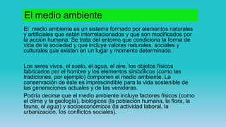 El documento trata sobre el medio ambiente y la contaminación. Explica que el medio ambiente incluye factores naturales y artificiales que están interrelacionados. Luego describe los principales tipos de contaminación como la del agua, suelo y aire. Finalmente, habla sobre el calentamiento global y sus causas artificiales como la quema de combustibles fósiles y la deforestación.
