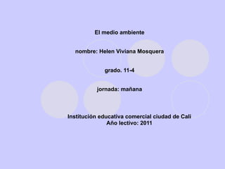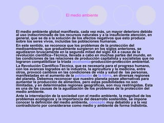 El documento habla sobre la importancia del medio ambiente y la necesidad de protegerlo. Explica que el deterioro del medio ambiente se debe al uso excesivo de los recursos naturales y la falta de atención a los efectos negativos de esto. También discute conceptos como desarrollo sostenible y la importancia de la educación ambiental para crear conciencia sobre estos temas.
