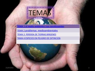 El documento presenta 4 temas principales sobre el medio ambiente: 1) los constituyentes del medio ambiente, 2) los problemas medioambientales, 3) la pérdida de tierras vírgenes, y 4) las especies en peligro de extinción. Explica los componentes clave del medio ambiente como la atmósfera, el agua y el suelo, y cómo los seres humanos han causado problemas medioambientales a través de la industrialización y el crecimiento de la población. También describe cómo se están destruyendo las tierras v