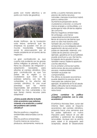 La crisis económica amenaza los fondos destinados a proyectos ambientales y la llegada de ayudas internacionales. Por un lado, la recesión puede tener efectos positivos como un menor consumo y emisiones, pero también negativos como una mayor explotación de recursos. Además, la crisis debilita las negociaciones sobre acuerdos internacionales para combatir el cambio climático ya que los países buscan reducir sus compromisos.