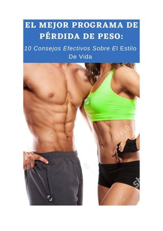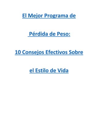 Este documento proporciona 10 consejos efectivos sobre el estilo de vida para un programa de pérdida de peso exitoso. Estos incluyen hacer ejercicio regularmente, levantar pesas, mantener un registro de alimentación y actividad, identificar y controlar los factores que causan comer en exceso, unirse a un grupo de apoyo, comer de manera más consciente, disfrutar de pequeños progresos, masticar bien la comida, comer menos grasas no saludables y enfocarse en vivir de manera saludable en general, no