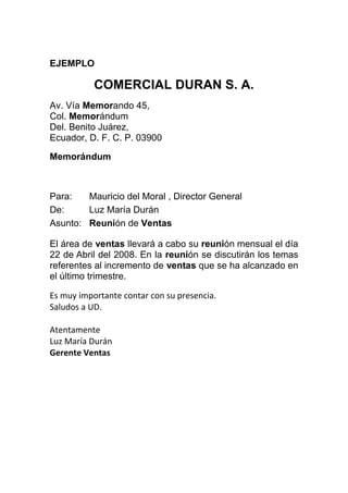 El memorándum es un documento breve utilizado para comunicar asuntos administrativos dentro de una empresa o institución. Tiene un formato estándar que incluye el nombre de la persona a quien va dirigido, el remitente, la fecha, el asunto y un escrito breve, además de la firma. El ejemplo muestra un memorándum que invita al director general a una reunión de ventas para discutir el incremento de ventas del último trimestre.