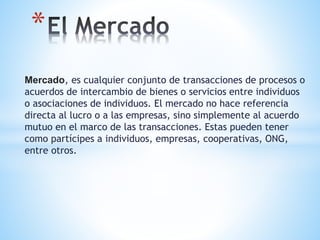 Este documento define el mercado como cualquier conjunto de transacciones o intercambios de bienes y servicios entre individuos u organizaciones. Describe tres tipos principales de mercados: mercados de consumo, mercados de servicios y mercados industriales o institucionales. Concluye que la importancia del mercado radica en que permite que la oferta y demanda se encuentren para satisfacer las necesidades de productores y consumidores, y en su poder para fijar los precios de bienes y servicios.