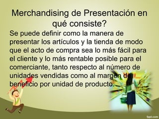 Este documento habla sobre el merchandising de presentación y las condiciones ambientales en los puntos de venta. Explica que el merchandising consiste en presentar los artículos y la tienda de una manera que facilite las compras para los clientes y maximice las ventas y ganancias para los comerciantes. También cubre elementos como la música, los olores y la animación que se usan para crear una atmósfera adecuada en la tienda y afectar el estado de ánimo de los clientes.