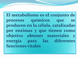 El documento describe los procesos metabólicos que ocurren en las células para obtener energía y materiales a través del catabolismo y anabolismo. El catabolismo incluye procesos como la glucólisis, ciclo de Krebs y cadena transportadora de electrones para producir ATP. El anabolismo usa esta energía para sintetizar moléculas como proteínas, lípidos y carbohidratos.