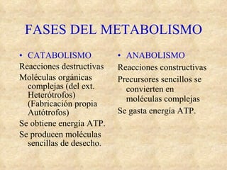 El documento describe los procesos metabólicos de las células, incluyendo el catabolismo y anabolismo. El catabolismo incluye la glucólisis, el ciclo de Krebs y la cadena transportadora de electrones para producir energía ATP. El catabolismo de lípidos y proteínas también se describe brevemente.