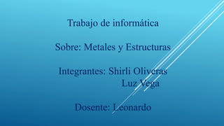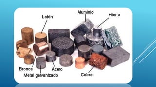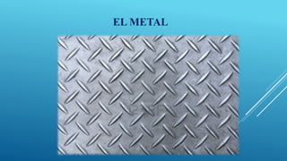 El documento describe las propiedades de los metales. Explica que los metales son buenos conductores del calor y la electricidad debido a que sus electrones de valencia forman una "nube electrónica" o "gas electrónico" que les permite moverse libremente. También detalla algunas propiedades físicas comunes de los metales como su brillo metálico, alta densidad y ductilidad. Finalmente, explica cómo se obtienen y usan diferentes metales en la industria.