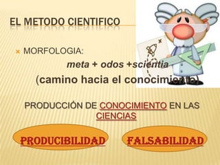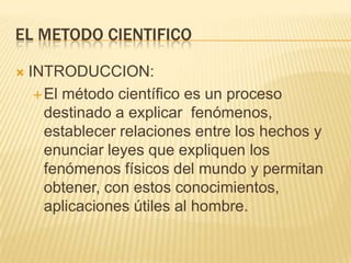 Este documento describe el método científico, el cual consiste en una serie de pasos para alcanzar conocimientos válidos a través de observaciones, hipótesis, experimentación y teorías. El método científico comienza con la observación de un fenómeno y la formulación de hipótesis para explicarlo, luego la experimentación para verificar las hipótesis, y finalmente el desarrollo de una teoría científica bien fundamentada.