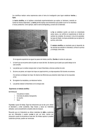 Este documento describe los pasos del método científico, incluyendo la observación, planteamiento del problema, formulación de hipótesis, experimentación, análisis de resultados y conclusiones. Además, explica conceptos como teoría, ley y variables. Finalmente, presenta un ejemplo de experimento siguiendo estos pasos para estudiar la fotosíntesis en plantas.