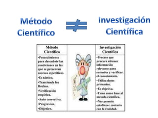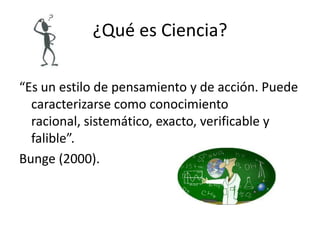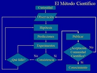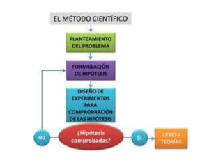Este documento describe el método científico. Explica que la ciencia busca explicaciones satisfactorias de la realidad a través de leyes o principios generales que pueden ser probados y validados por la comunidad científica. Además, distingue entre conocimiento básico, tecnológico e intervención y clasifica las ciencias en lógicas, formales, naturales, sociales y biosociales. Finalmente, detalla los métodos inductivo y deductivo como enfoques de la investigación científica.