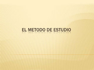El documento describe los pasos del método de estudio, incluyendo la pre-lectura, notas al margen, lectura comprensiva, subrayado, esquema, resumen y memorización. También destaca la importancia de crear condiciones propicias para el estudio, como un espacio tranquilo y ordenado, buena iluminación, y estar bien descansado y con buena disposición para aprender.