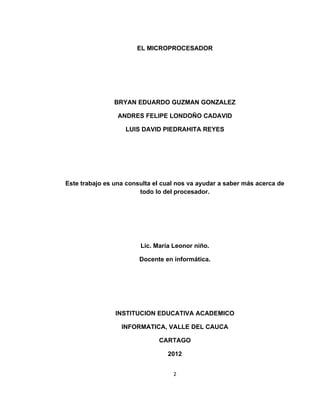 El documento describe el microprocesador, incluyendo su función como unidad central de procesamiento, sus partes internas como la unidad aritmético-lógica y los registros, y los diferentes tipos de operaciones que puede realizar como transferencia de datos, operaciones aritméticas y lógicas. También brinda una breve historia de los microprocesadores y describe algunos modelos antiguos y modernos.