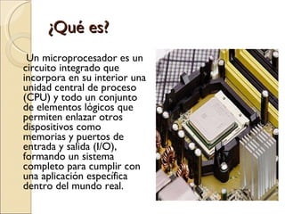 Un microprocesador es un circuito integrado que contiene una unidad central de proceso y elementos lógicos para enlazar dispositivos, funcionando como el cerebro de la computadora. Considerado esencial, un microprocesador está conformado por millones de transistores que realizan diversas funciones. La competencia entre Intel y AMD ha dado lugar a diferentes generaciones de microprocesadores desde 1971, con productos destacados como los chips de Intel Pentium y los procesadores AMD Athlon.
