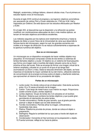 El microscopio ha tenido un papel fundamental en el desarrollo de la ciencia. Se remonta al siglo XVI cuando los hermanos Jansen inventaron el primer microscopio compuesto en Holanda. Más tarde, Antonie van Leeuwenhoeck observó bacterias, glóbulos rojos y espermatozoides con sus propios microscopios de alta potencia. En el siglo XVII, Robert Hooke usó un microscopio para observar por primera vez células en un trozo de corcho, mientras que Marcelo Malpighi estudió tejidos vivos. Hoy
