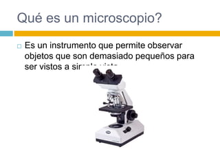 El documento describe la historia, partes, funcionamiento y tipos de microscopios. Explica que los microscopios permiten observar objetos demasiado pequeños para verlos a simple vista y que han evolucionado desde los primeros diseños chinos y europeos hasta los modernos microscopios electrónicos. Detalla los componentes ópticos, mecánicos e iluminación de un microscopio óptico convencional así como técnicas de enfoque y mantenimiento. Finalmente, menciona que los microscopios son herramientas vitales en microbiolog