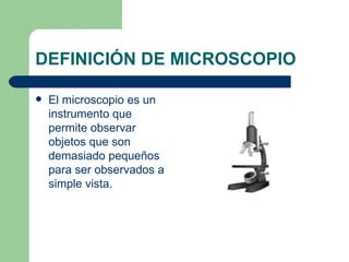 El documento describe los diferentes tipos de microscopios, incluyendo el microscopio óptico, el microscopio simple que utiliza una sola lente, el microscopio compuesto que tiene más de una lente, y el microscopio electrónico que usa electrones en lugar de luz. También menciona que Galileo y Janssen son considerados inventores del microscopio y que Galileo fue un científico importante en los campos de la astronomía, la filosofía y la física.