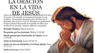 El documento describe el ministerio terrenal de Jesús. Pasó 40 días en ayuno y oración antes de comenzar su ministerio público. Luego enseñó, predicó y sanó a la gente a través de milagros. También llamó a doce discípulos para que aprendieran y continuaran su obra de llevar el evangelio al mundo.