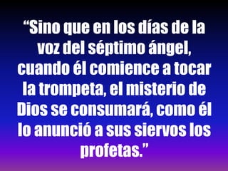 El documento explora el concepto de 'misterio' en la Biblia, enfatizando su relación con el plan de redención de Dios a través de Yeshúa Ha Mashiaj y su significado en diversas escrituras. Se menciona el momento de la séptima trompeta como la culminación del misterio, donde se revela el plan de Dios y se completa la redención. Finalmente, se concluye que los creyentes deben actuar como Juan, promoviendo la enseñanza de la Torá en espera del regreso de Yeshúa.