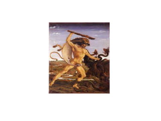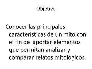 El documento define el mito como una narración maravillosa protagonizada por personajes divinos o heroicos que intenta explicar el origen del mundo o grandes acontecimientos de la humanidad. Explica que los mitos se caracterizan por contener temáticas fabulosas sobre dioses y héroes del pasado remoto y que sus principales características incluyen intentar explicar misterios de la realidad a través de seres sobrenaturales en un tiempo anterior al actual. Finalmente, señala que los mitos son relatos muy antiguos transmitidos oralmente