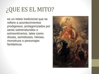 El mito es un relato tradicional que involucra eventos extraordinarios protagonizados por seres sobrenaturales como dioses o héroes. Existen varios tipos de mitos, incluyendo mitos cosmogónicos que explican la creación del mundo, mitos teogónicos sobre el origen de los dioses, y mitos antropogénicos sobre el origen de la humanidad. Otros tipos son los mitos etiológicos sobre el origen de cosas en el mundo, los mitos morales sobre el bien y el mal, y los mitos escatológic