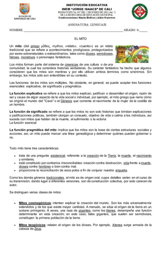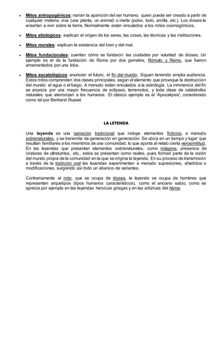 El documento explica las diferencias entre mitos y leyendas. Los mitos son relatos tradicionales que involucran seres sobrenaturales y explican aspectos de la vida como el origen del mundo. Tienen funciones explicativas, de significado y pragmáticas. Las leyendas también son narrativas tradicionales pero incluyen elementos ficticios y se ubican en tiempos y lugares familiares, aunque presentan eventos sobrenaturales como reales. Mientras los mitos se enfocan en dioses, las leyendas se centran en hombres ar