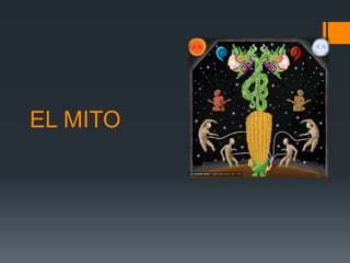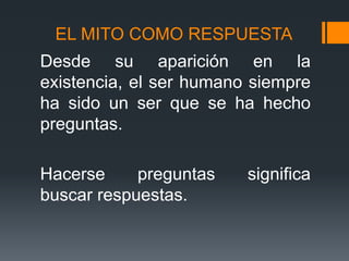 El documento explica que los mitos surgieron como una forma que tuvieron las sociedades antiguas de dar explicación a los fenómenos naturales que no podían comprender, como parte de una mentalidad animista. Los mitos se transmitían oralmente y narraban historias de dioses y héroes sobre el origen del mundo y otros temas trascendentales para las culturas, cumpliendo un rol explicativo y sagrado.